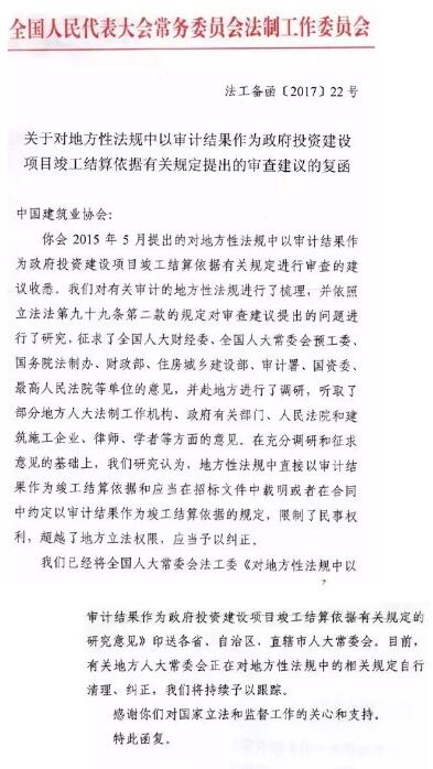 全國(guó)人大常委會(huì)法工委日前在回復(fù)中國(guó)建筑業(yè)協(xié)會(huì)《關(guān)于對(duì)地方性法規(guī)中以審計(jì)結(jié)果作為政府投資建設(shè)項(xiàng)目竣工結(jié)算依據(jù)有關(guān)規(guī)定提出的審查建議的復(fù)函》中提出,地方性法規(guī)中直接以審計(jì)結(jié)果作為竣工結(jié)算依據(jù)和應(yīng)當(dāng)在招標(biāo)文件中載明或者在合同中約定以審計(jì)結(jié)果作為竣工結(jié)算依據(jù)的規(guī)定,限制了民事權(quán)利,超越了地方立法權(quán)限,應(yīng)當(dāng)予以糾正。且法工委已將研究意見(jiàn)印送各省、自治區(qū)、直轄市人大常委會(huì)。目前,有關(guān)地方人大常委會(huì)正在對(duì)地方性法規(guī)中的相關(guān)規(guī)定自行清理、糾正。